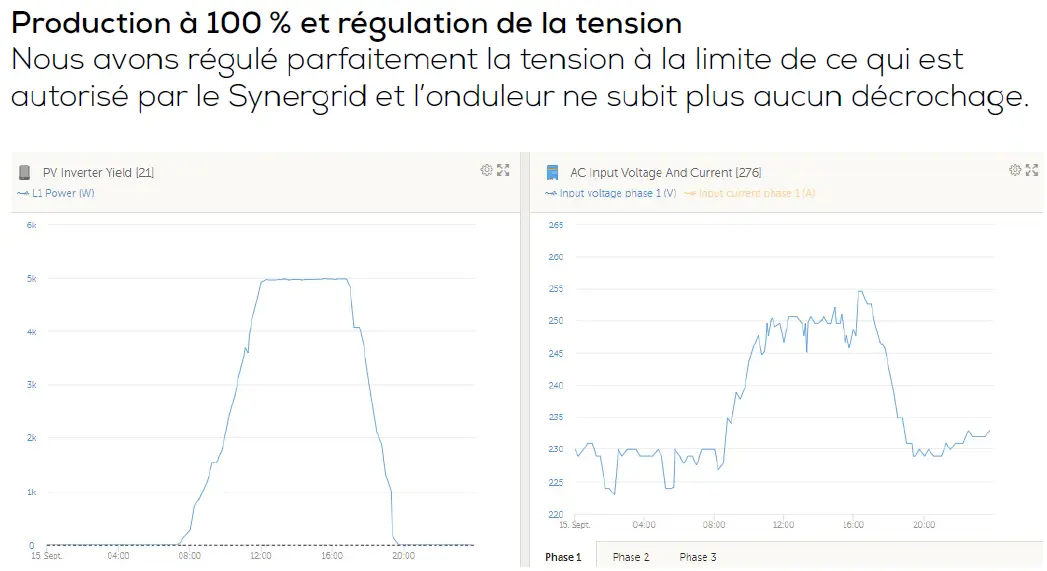 Le résultat est spectaculaire : production solaire à 100 %, tension régulée selon les normes Synergrid, et un onduleur qui reste stable en permanence.