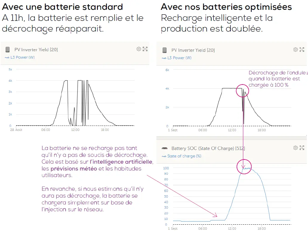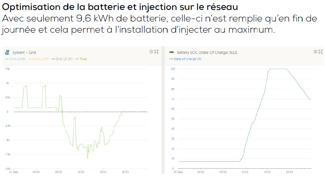 Même avec une batterie de seulement 9,6 kWh, nos systèmes optimisent le remplissage en fin de journée et maximisent l’injection utile sur le réseau.